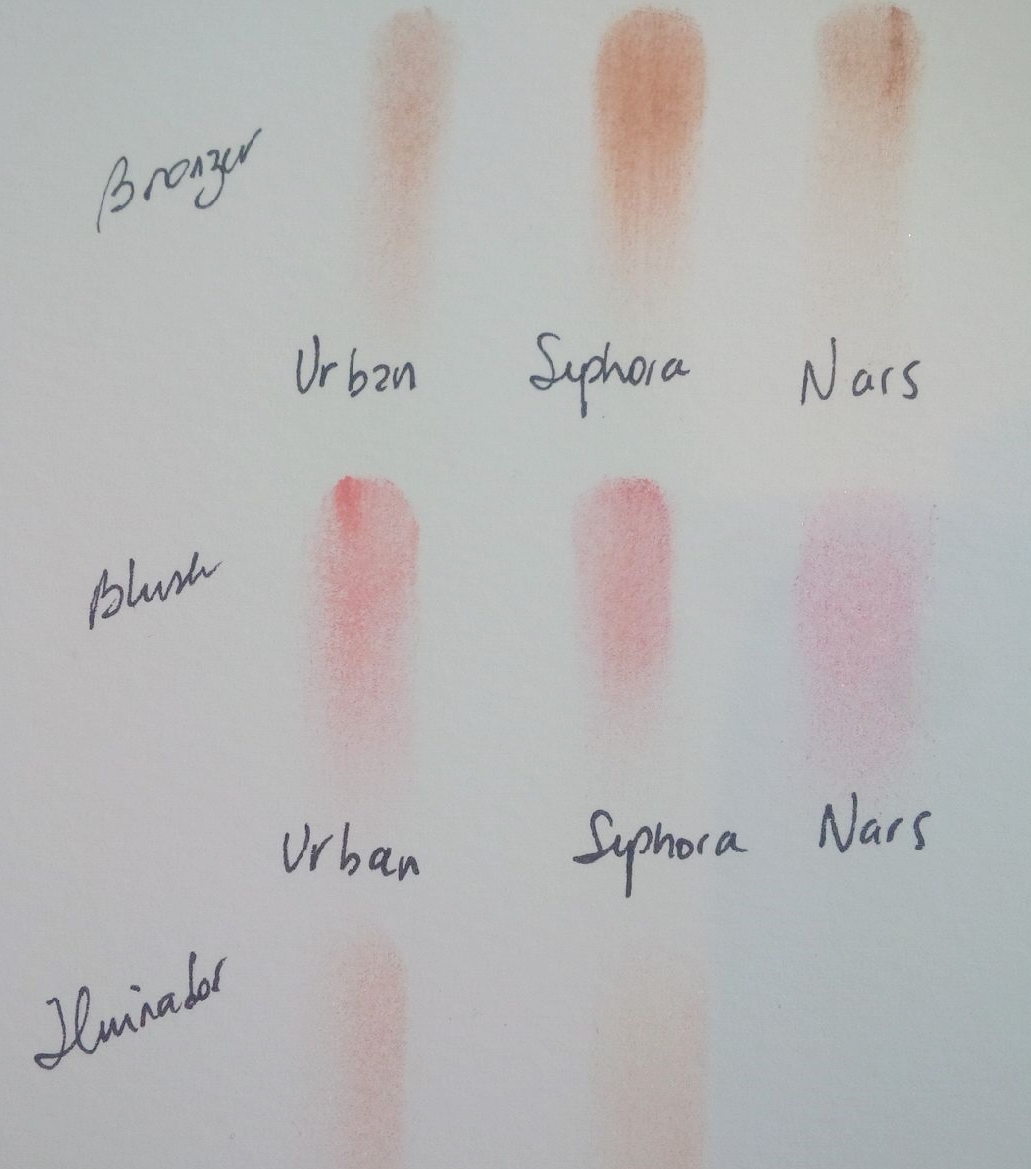 El de Urban Decay me encantó la textura al tocarla, a pesar de ser una muestra se puede ver lo sedosa que es. El rosa del blush es MUY intenso porque tanto el rubor como el polvo bronzeante no tienen brillo, eso hace sean mas intensos. Pero como el bronzer es mas claro q lo otros dos, se ve bastante parecido en la piel a los otros dos. El iluminador es un ÉXITO. Super lindo, muy doradito, va con cualquier tipo de piel. Me encantó.