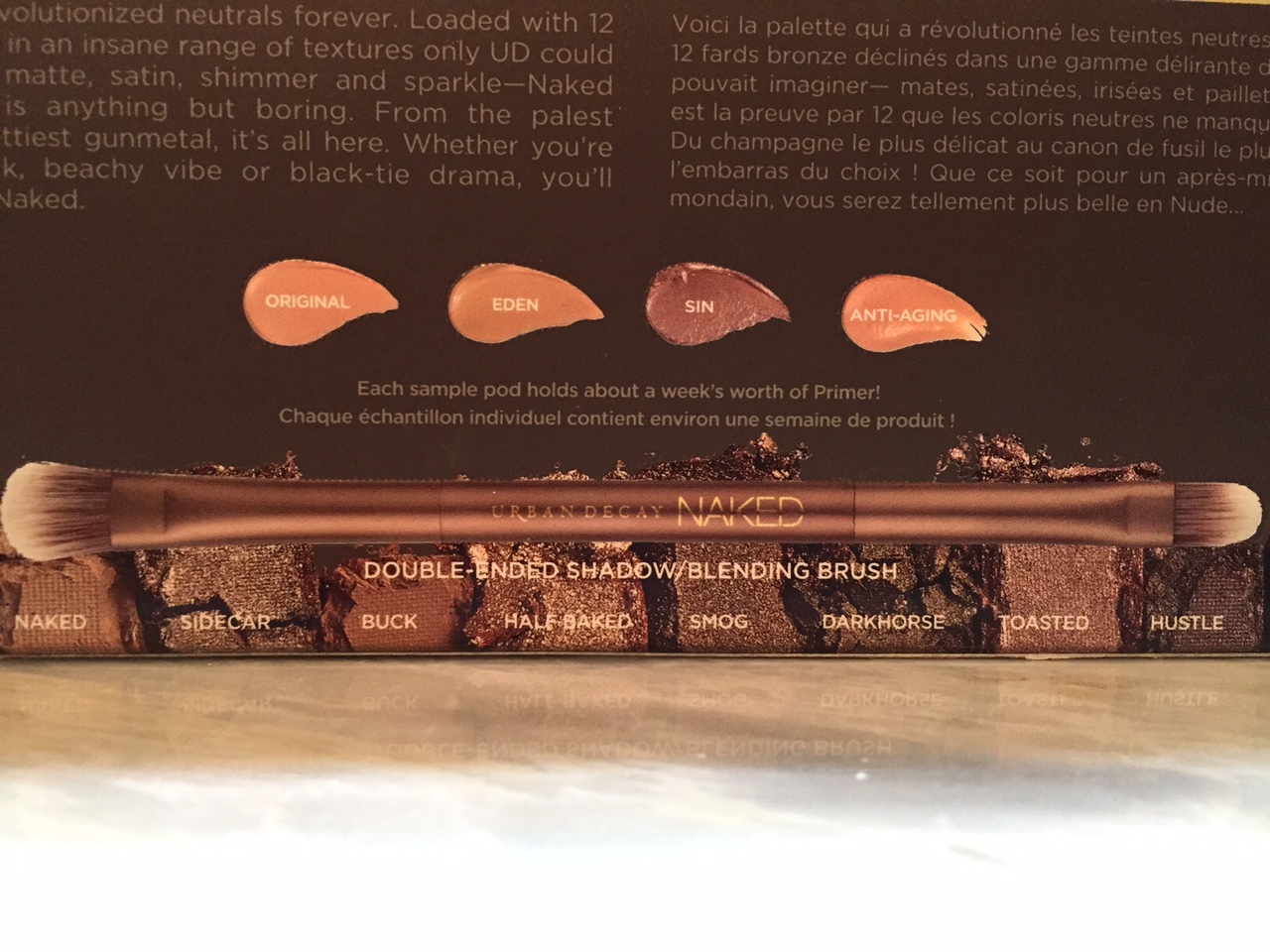 Eso si, tiene un plus…o dos..su pincel aplicador es espectacular (con lo cual es un costo importante que se ahorran al no tener que comprar uno, eso deben considerarlo dentro los $54 dólares del precio), y además incluye una muestra de 4 tipos de primers de sombra, que si nunca probaron uno es una excelente oportunidad de hacerlo.
