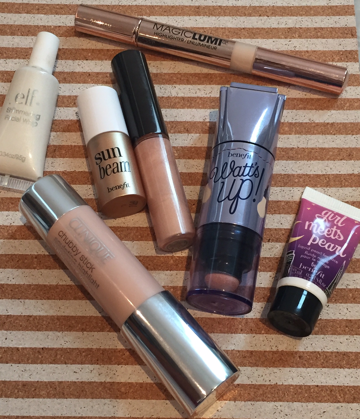 Algunos de los líquidos que he usado: Amor incondicional por Watts Up de Benefit y el Iluminador de Becca en tono Opal (el de tapa negra de la foto). Sun Beam y Girls Meets Pearl, otras opciones de Benefit. El Chubby Stick de Clinique es lindo pero bien rosado, el de Elf es un poco…