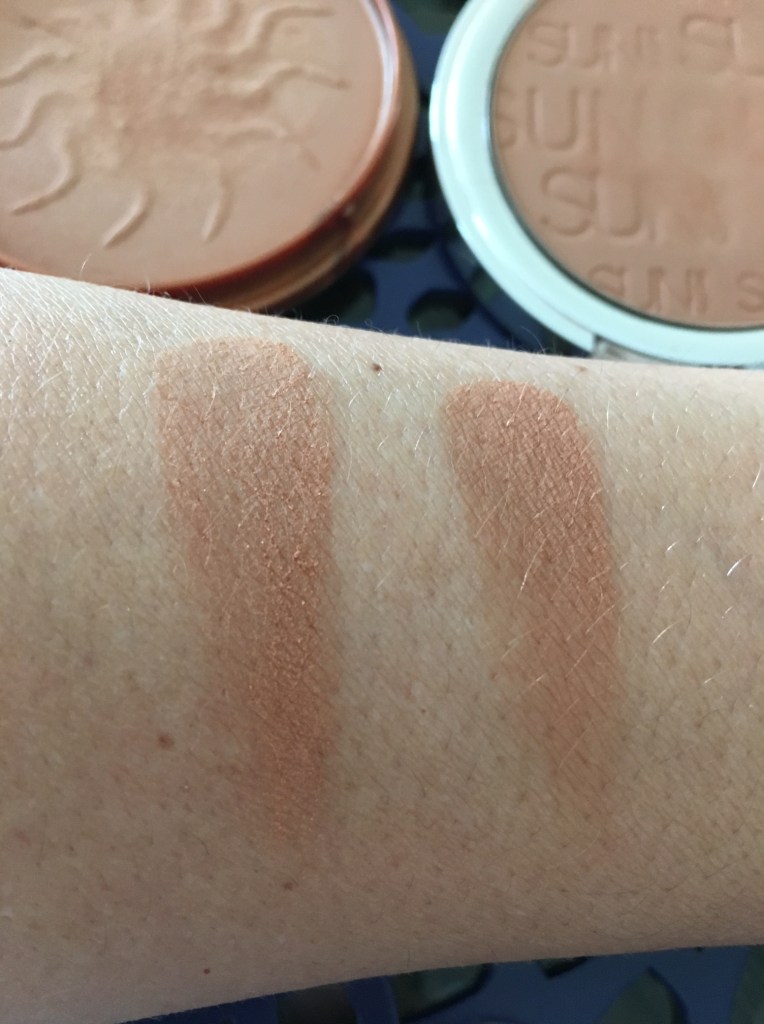 Como bien se ve en la foto ambos son mates. Los dos pigmentan bien. Si quiero ponerme algo picky diría que el de Catrice es un poco más intenso o más naranja y el de Rimmel da un efecto más natural. En ese sentido, el de Rimmel es más manejable al colocarlo en la cara, con el de Catrice hay que ser un poco más cuidadosas para que no se vea un bronceado demasiado artificial.