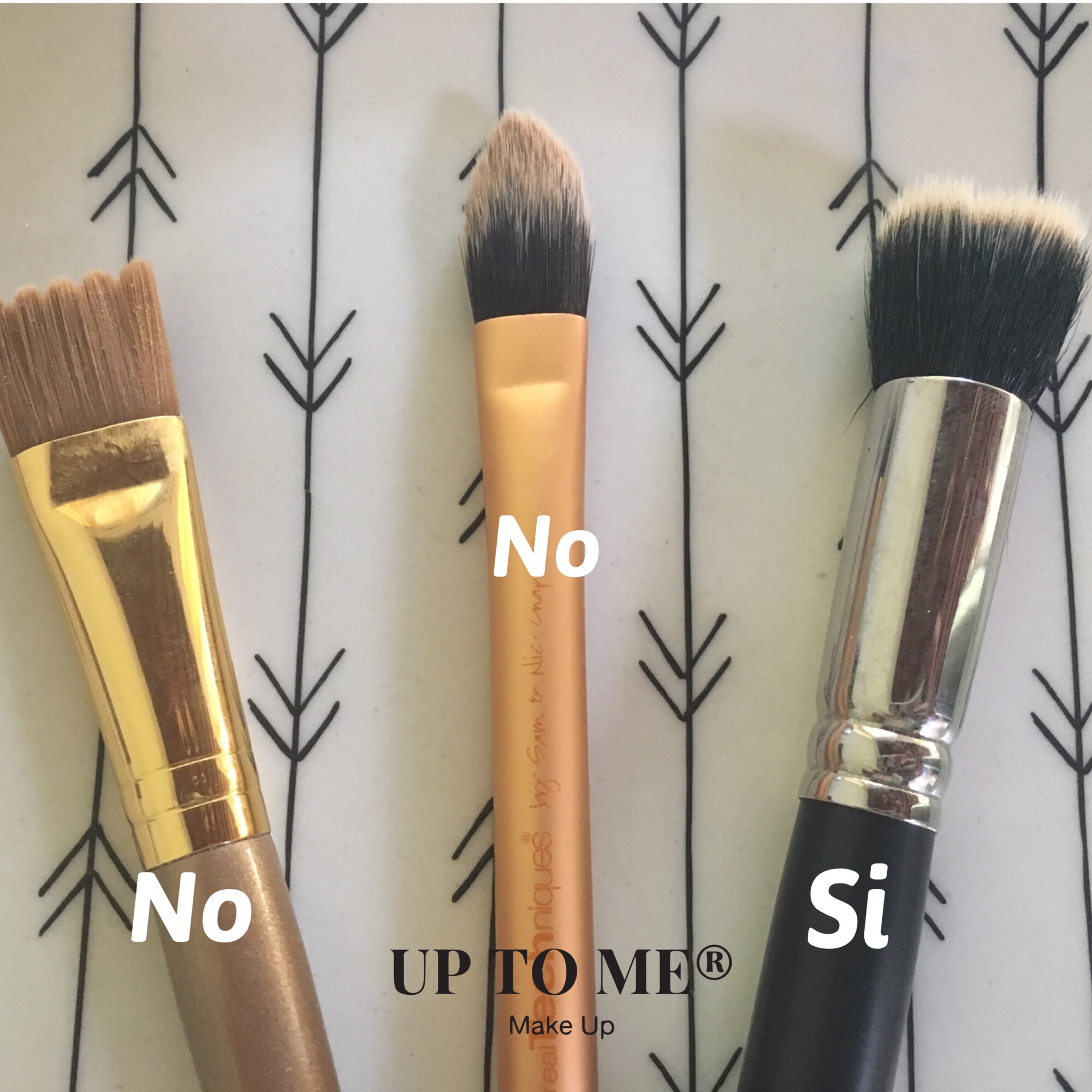 Las brochas que son así como la de la foto, chatas, tupidas, tipo kabuki son las mejores. La que no les recomendaría, especialmente si su piel tiene imperfecciones es la tipo «lengua de gato». Esas brochas planas, que fueron las 1eras que salieron al mercado, hacen un poco el efecto de la mano, porque dejan mucho producto (dando mayor cobertura) pero depositan demás en las imperfecciones (poros, arrugas, marcas en la piel) y no es tan práctica para hacer círculos al aplicar y poder pulir la piel, mientras que vamos dejando producto.