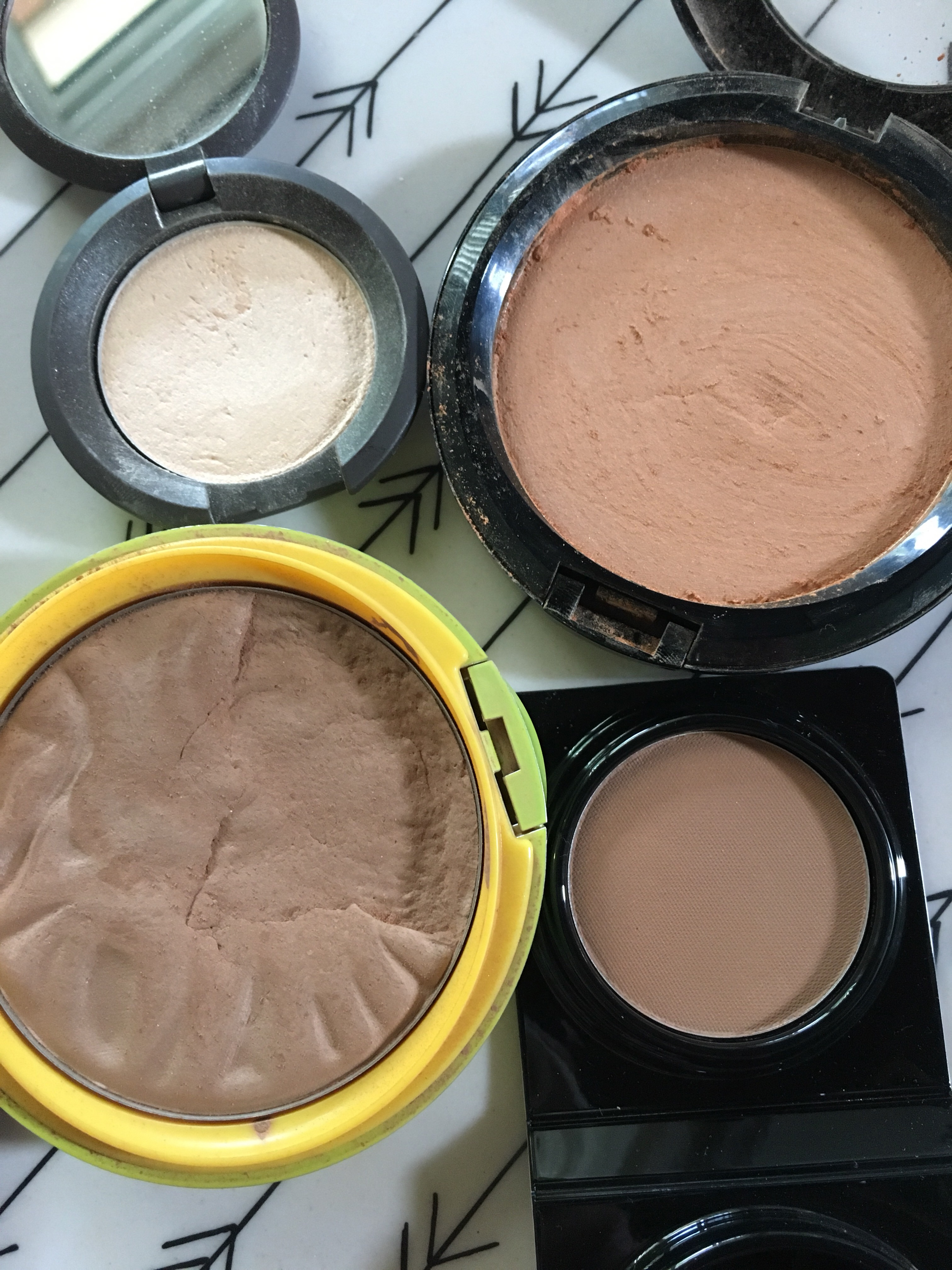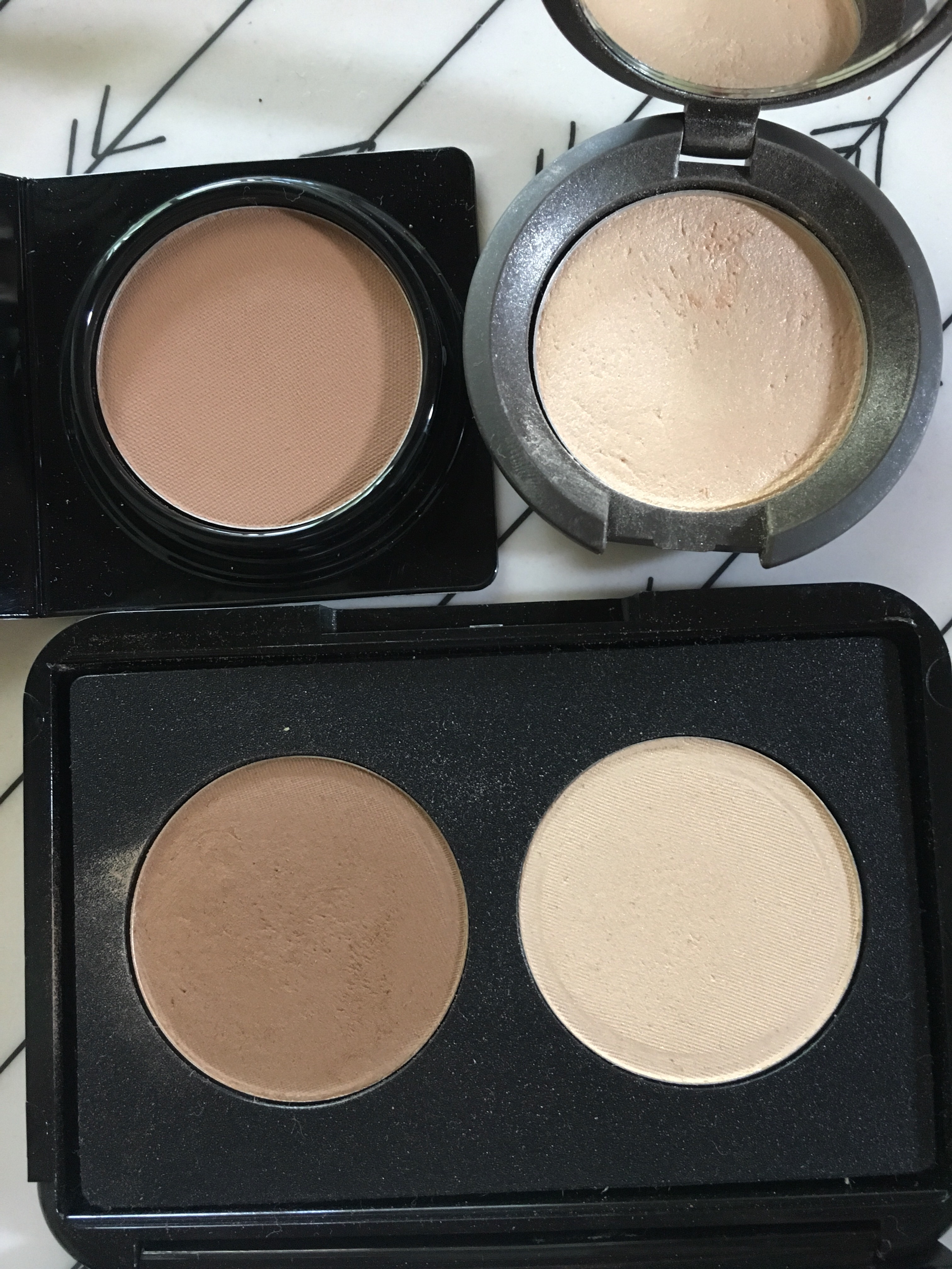 Claramente no es un polvo iluminador claro como el Moonstone de Becca que ven arriba a la izquierda pero tiene brillo. El acabado que deja en la piel, está muy cerca de mi amado Butter Bronzer de Physician Formula (abajo izquierda), aunque ese es más marrón como mi otro favorito, el mate de Too Faced Chocolate Soleil (abajo derecha). Es decir…. NO sirve para contour ni para iluminar. Es como para broncear levemente las partes altas del rostro (frente, pómulos, alrededor del ojo, e incluso la nariz). Deja un efecto satinado INCREÍBLE. También probé otro, que ahora estoy en duda si era otro tono de este mismo, o qué, pero lo descarté, pero que era muy plateado y muuuuy brillante. No me gustó. Me dijeron que era para pieles más frías.