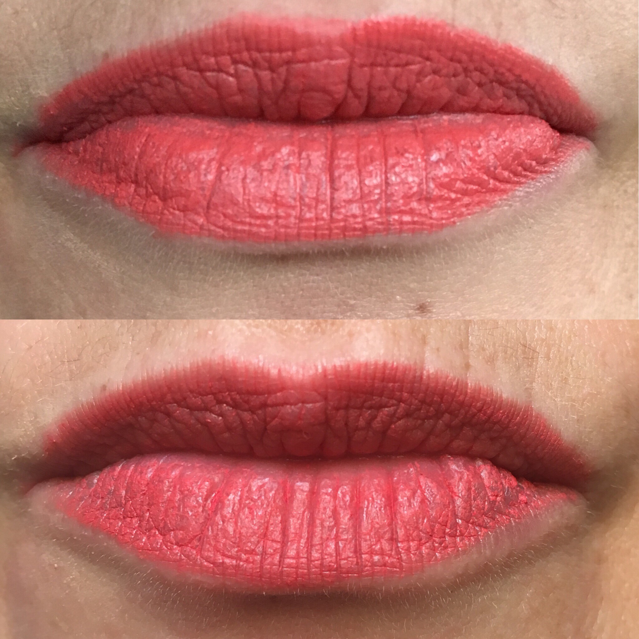 A pesar de probar con este tono, pude constatar las mismas 2 cosas que vi con el oscuro: Número 1 los labios se pegan entre si…pero maaaaal… se me hace insorportable. Si bien después se mejora, al secarse, lleva un tiempo bastante prudencial. Por otro lado no solo no dura miles de horas como escuché por ahí, sino que se seca y me hace unos pliegues horribles. Y ni hablar de la raya que se me hace en el interior del labio. No puedo con ella.