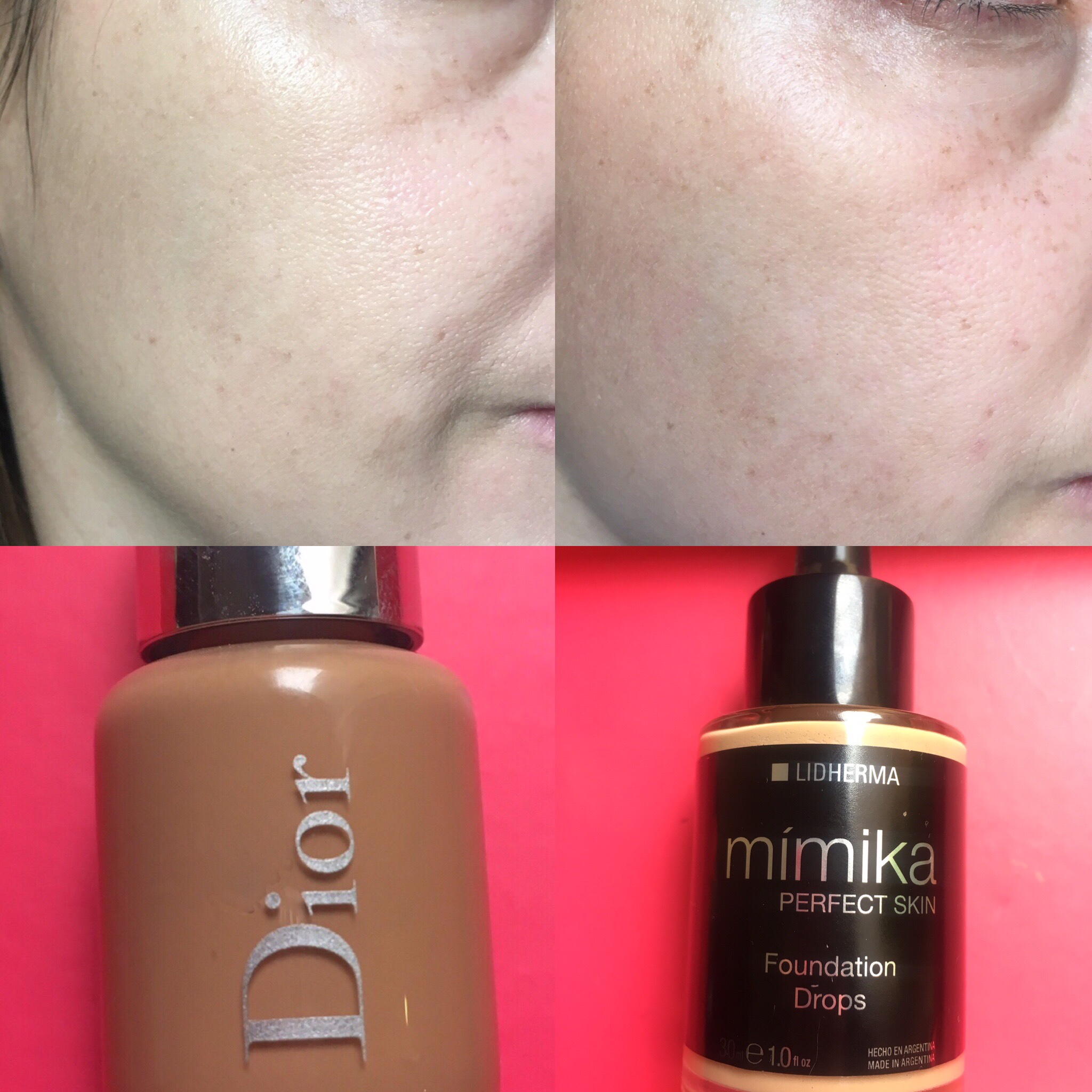 La de Mimika es tiene un acabado idéntico en cuanto a que tiene ese dejo mate, conforme se seca. Pero la cobertura es muuucho más baja. Pueden verlo en Las fotos: mis manchas y rojeces son más evidentes en la aplicación de la de Mimika versus la de Dior.
