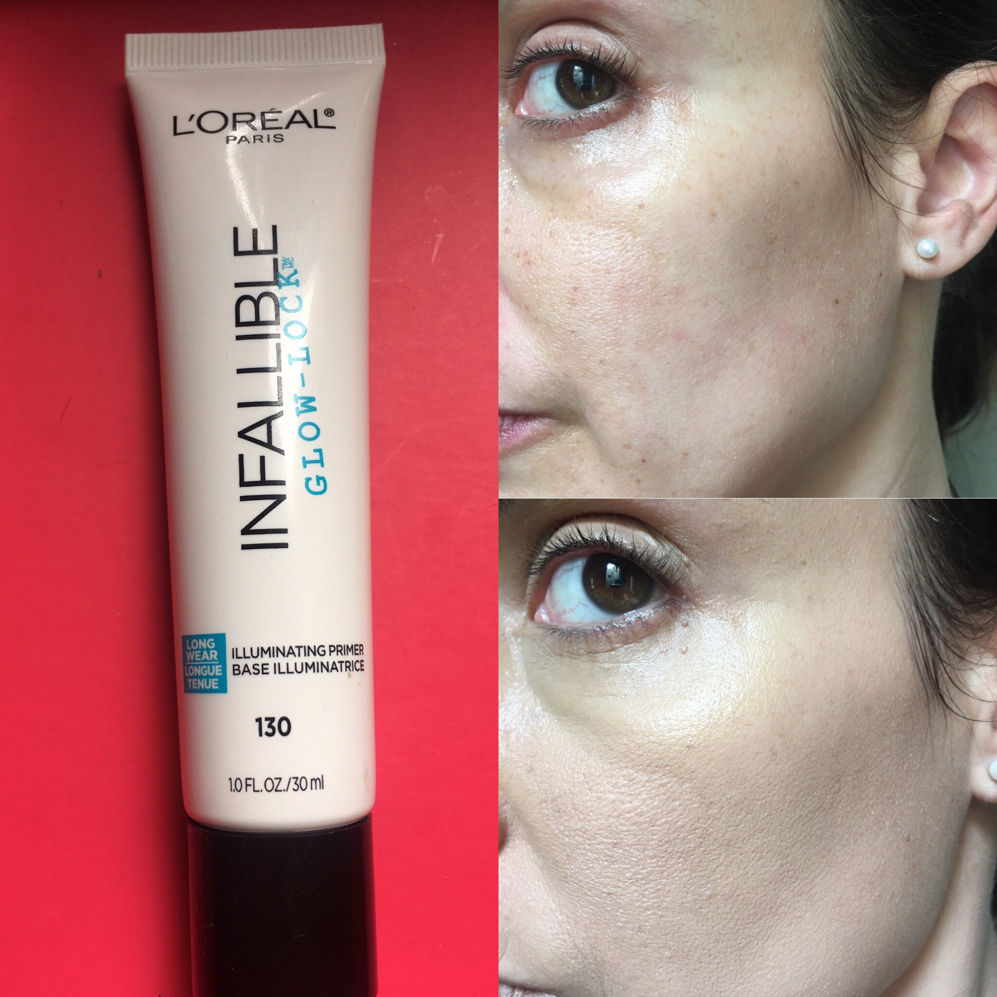 Y por último el efecto glow es casi casi nulo. El de L’Oréal, quizás por ese tornasol violáceo es un poco más notorio al mover el rostro. Porque da esa cosa medio «duocromo». Ahora no es «Ay que cosa de locos!!». Aclaro además, que tiene un olor bastante particular. Nada horrible ni que se sienta mucho una vez puesto, pero debo aclararlo. Se parece un poco al spray fijador de L’Oréal. Quizás sea el componente «fijador» que comparten.