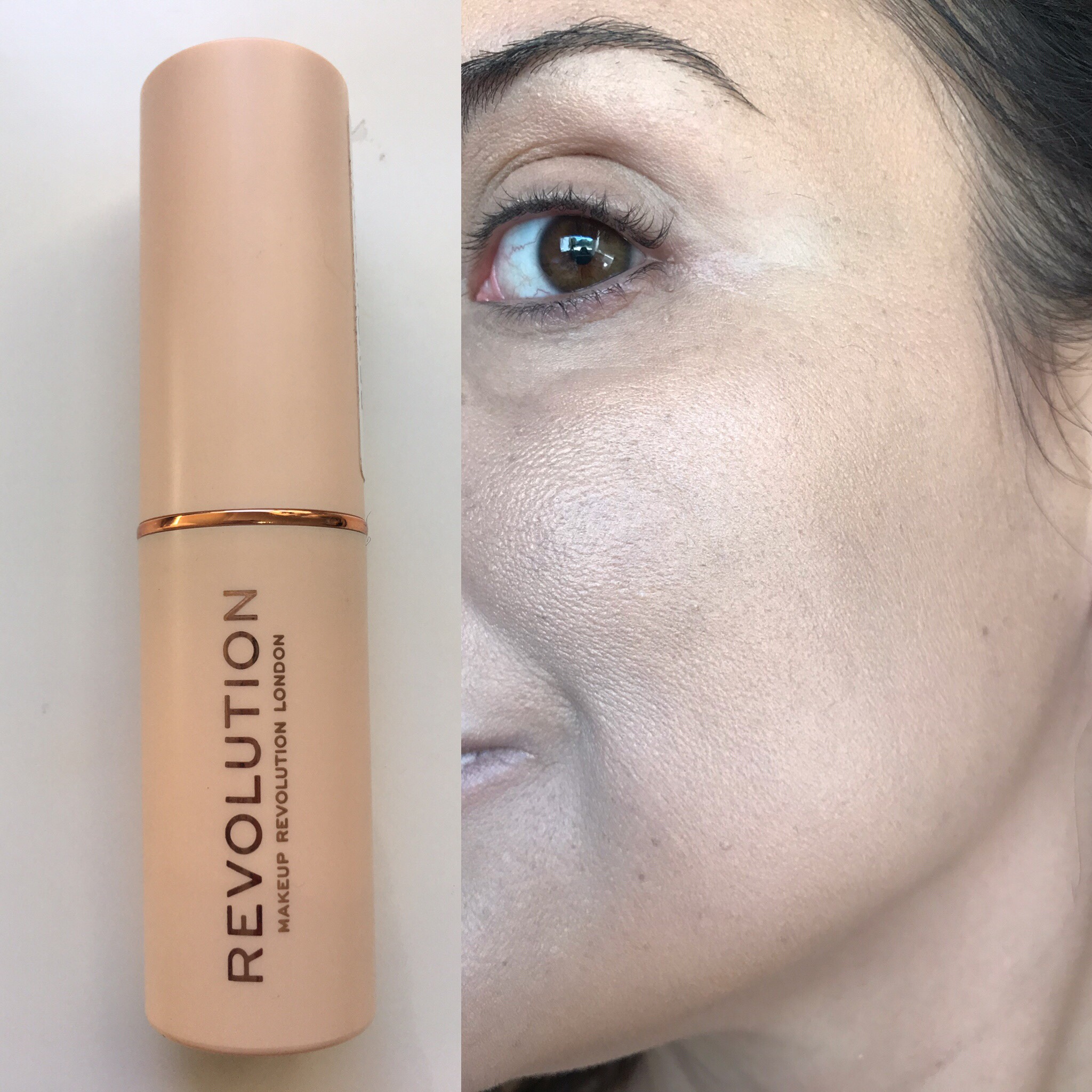 - La base en barra de Makeup Revolution (o Revolution Beauty ahora que le cambiaron el nombre a la marca). La compré en Ulta, en USA. Cuesta solo 9 dólares. Viene en 18 tonos. Trae 6.2grs (si! la mitad de la de MUFE). Yo soy el tono F8. Ver Producto Online