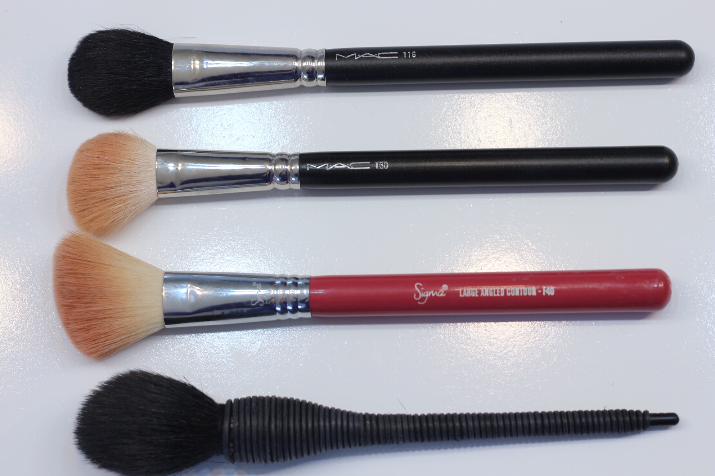 Lo importante acá es que no sea enorme. Las hay más chatas y redondas tipo la 116 o las chanfleadas como la 160 de MAC o F40 de Sigma. Que de hecho como les dije, también pueden servir para contorno. La última de la foto es mi copia de la auténtica Hachiyo de NARS que la amo y la uso para cualquier cosa en polvo por su tipo de forma en gota.