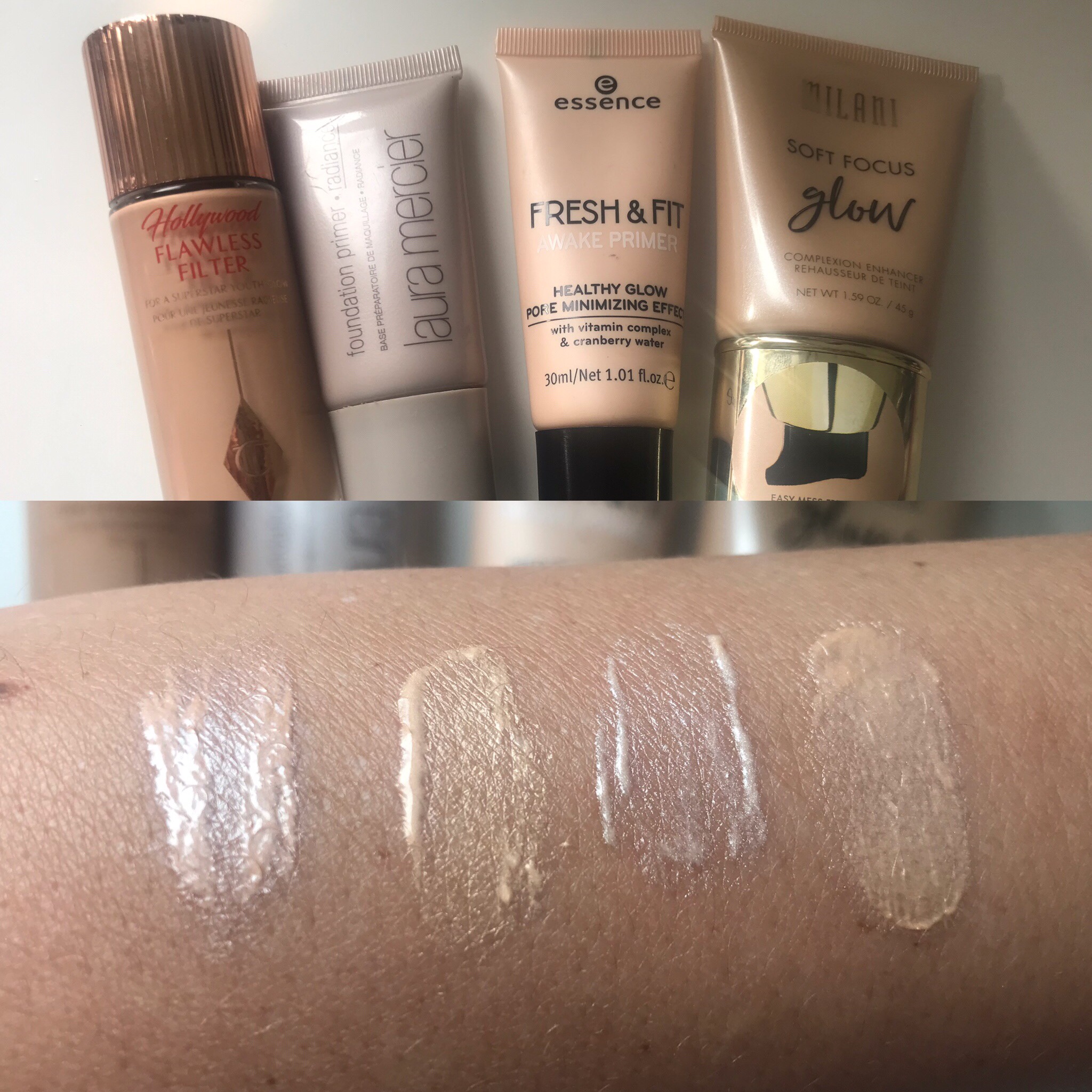 De todos estos hay 2 que me parecieron un hallazgo: El Fresh & Fit Makeup Primer de Essence y el Soft Glow de Milani (tono 01). Me hicieron acordar un poco también al famoso Hollywood Flawless Filter de Charlotte Tillbury (que es un producto de usos múltiple), aunque no es un dupe exacto, abajo van a poder compararlos.
