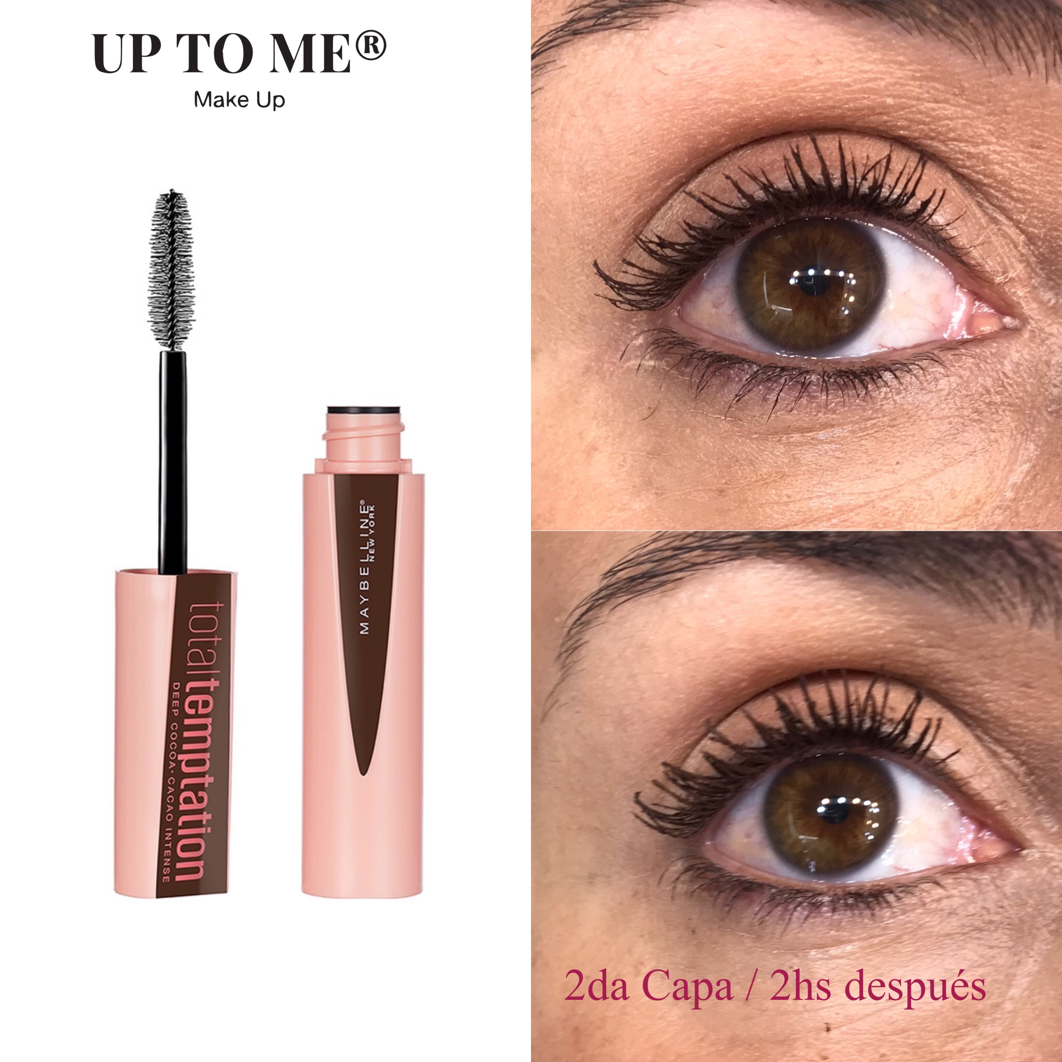 A mi me gusta mucho aplicar varias capas de máscara de pestañas, y con estas dos, si lo hago (para lograr un efecto más power) se me engruman y me mancho más de la cuenta. Entonces, lo que hice, para que vean la diferencia, es aplicar una 2da instancia de máscara, dos horas después de la primera.