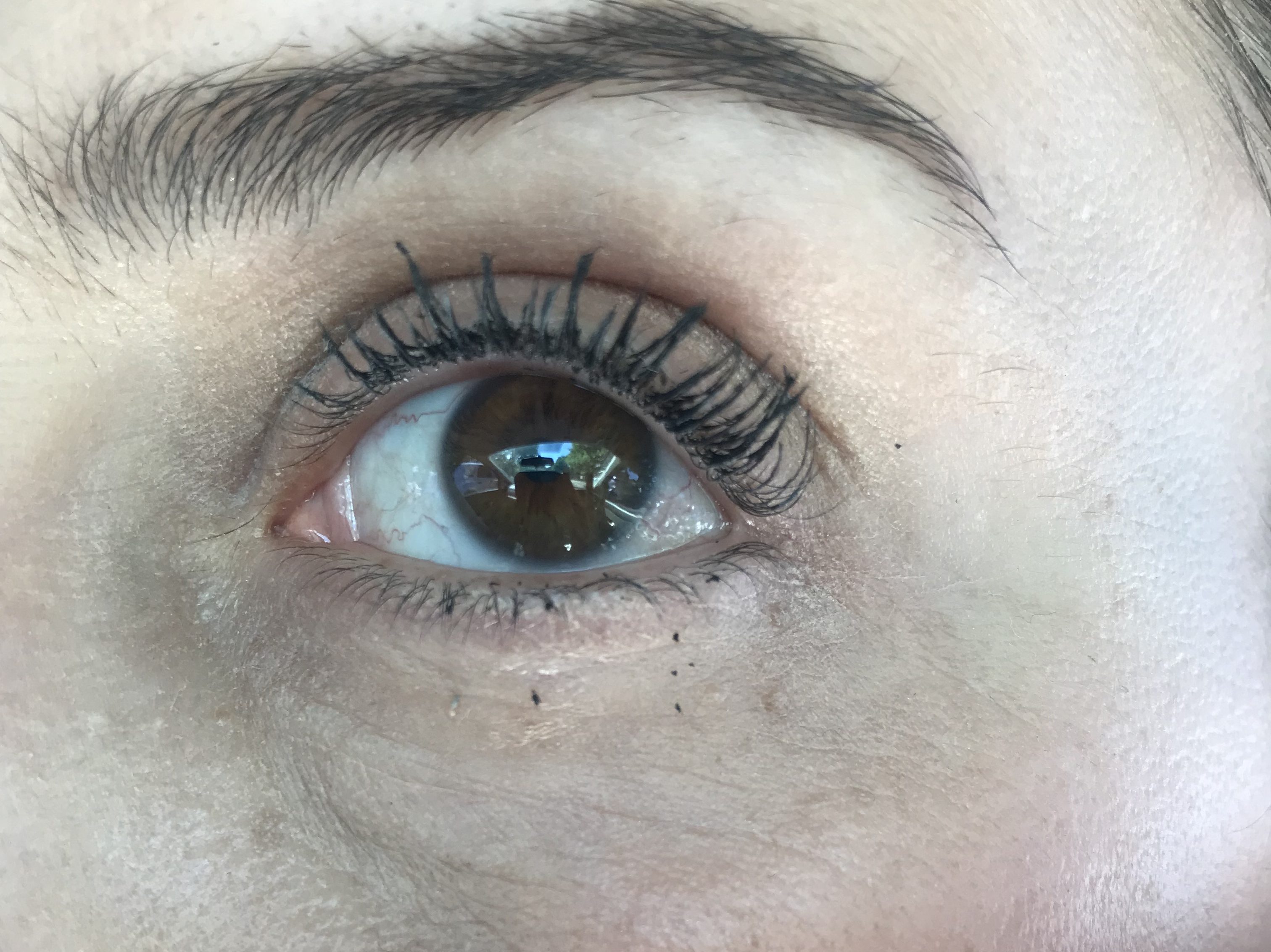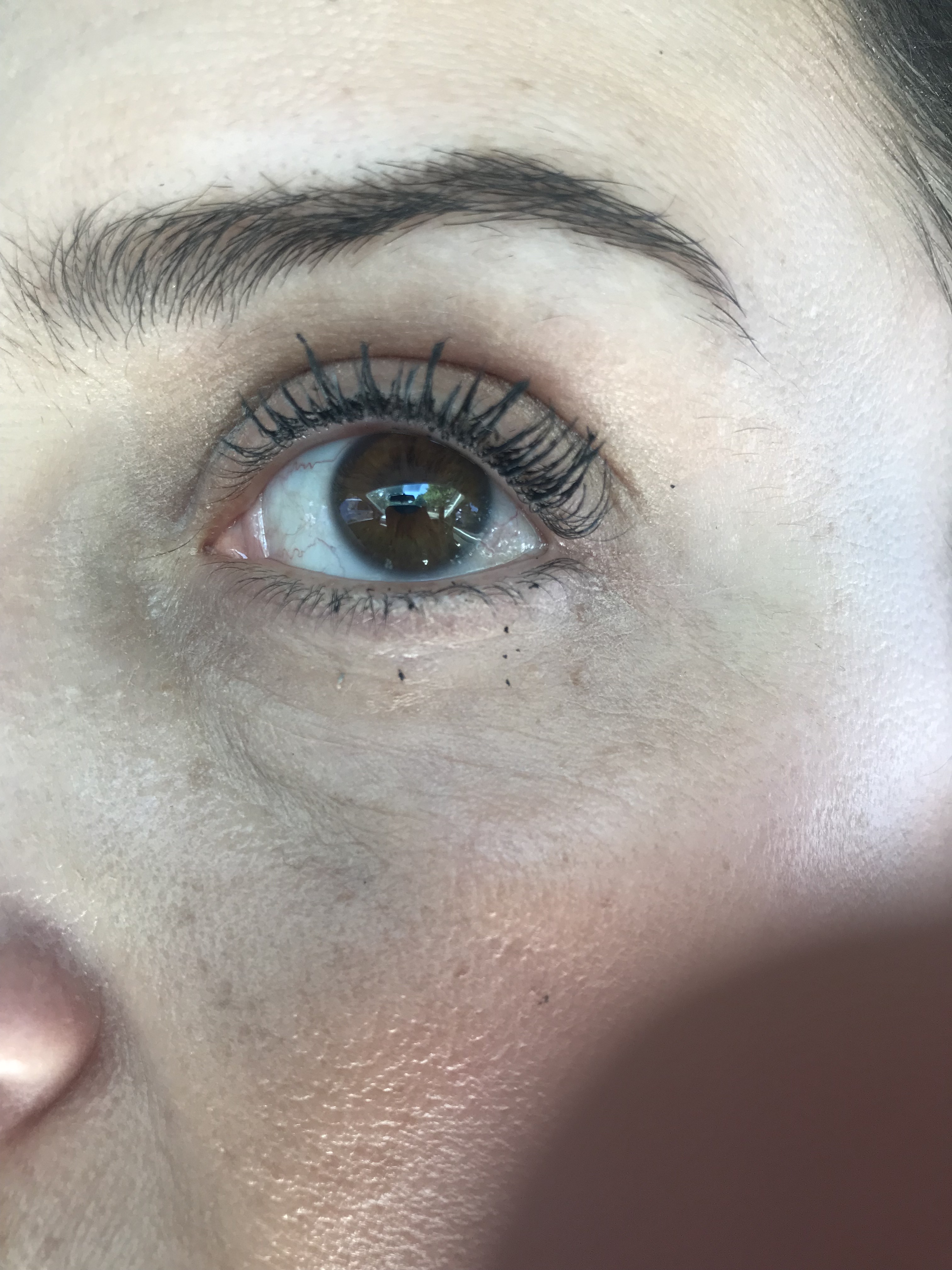 Decía que no me gusta por dos motivos: el primero, porque para crear el nivel de volumen que a mi me gusta (más bien denso), lo hace a fuerza de engrumar las pestañas, y al ser bien definidas y separadas, es como que queda visibles. Dejan a las pestañas como como palitos duros. Por otro lado, en particular más la de Avon que la de Extreme, durante la tarde, esos grumos secos, empiezan a caer en la ojera. SIN efecto mapache, porque no se corre. Pero quedan todos pedacitos negros. Miren como queda: