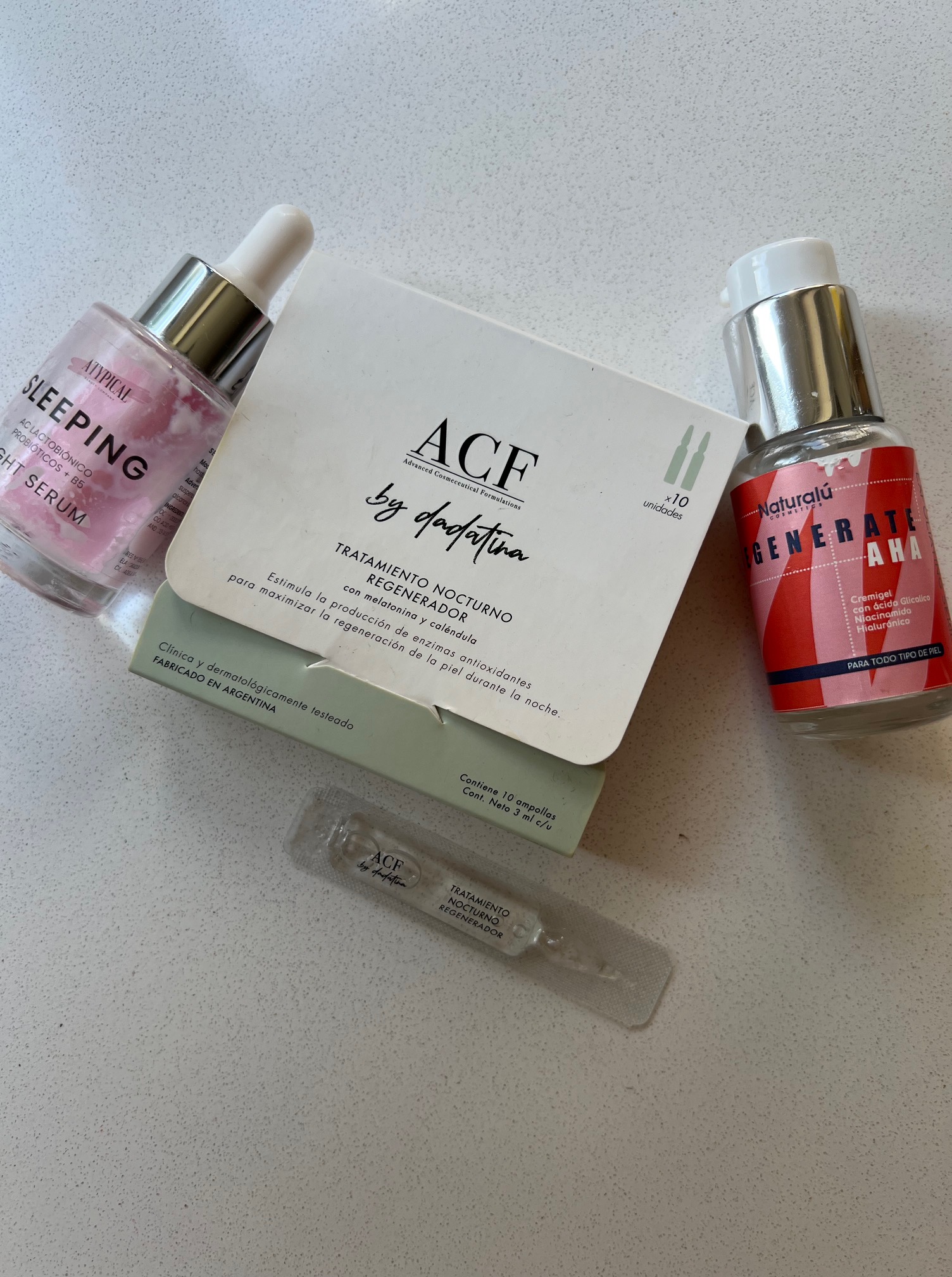 Por último, aproveché para probar un producto nuevo de Dada por ACF, que son las ampollas de tratamiento regenerador nocturno. Acá el efecto «reparador» no viene por el lado de los exfoliantes, sino de la melatonina. Si, la misma melatonina que escuchaste que sirve para dormir, es un activo que también se puede aplicar en la piel, que trabaja justamente reparándola mientras dormimos (que como ponerte una crema de mini siesta encima jaa…viste que amanecés cómo nueva?). También tiene caléndula, que funciona como antioxidante y calmante obviamente.
