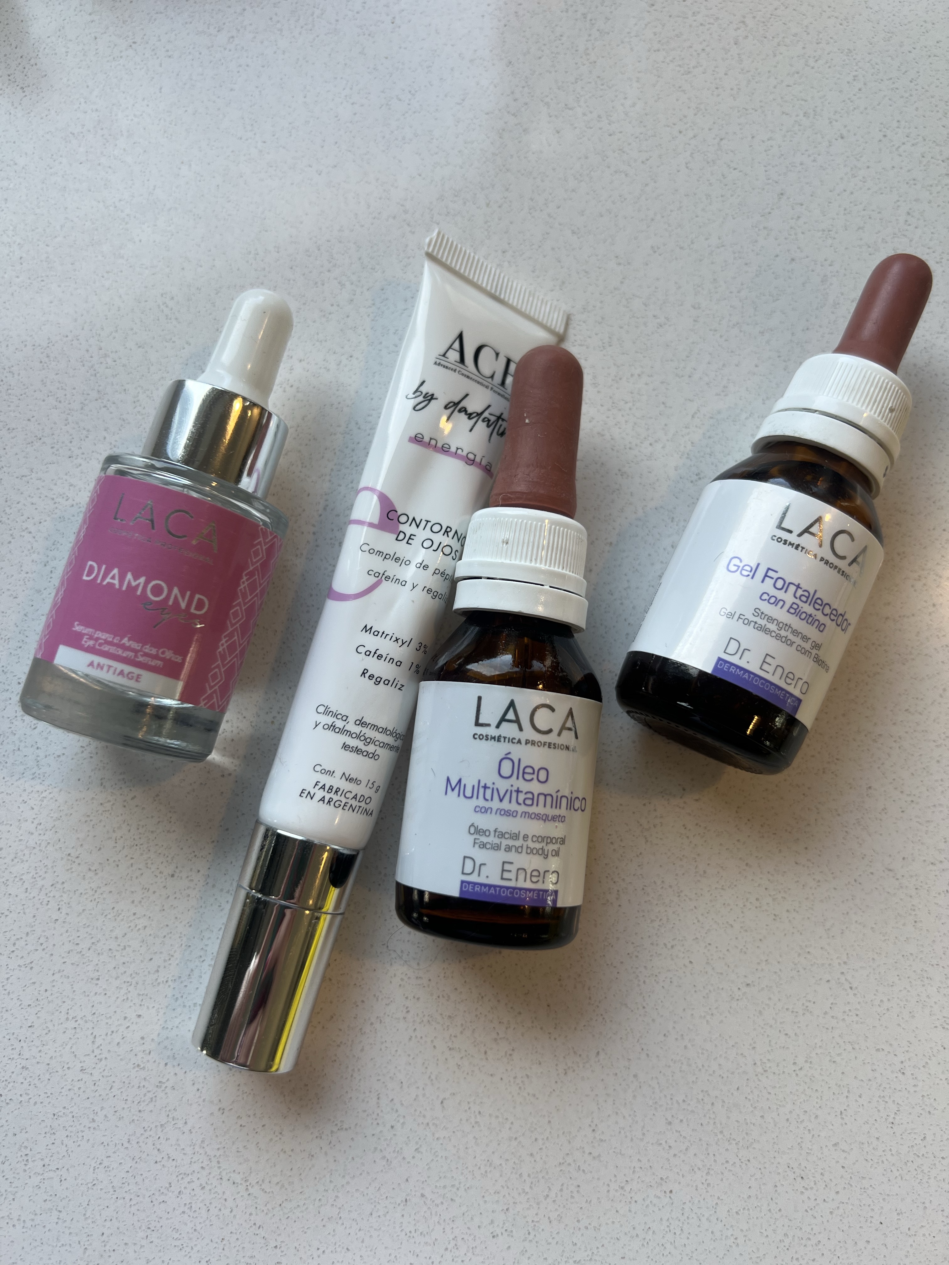 Acá tengo varias cosas que testeé y estoy segura les va a encantar tener mi veredicto. Por un lado de Laca me enviaron 2 cosas para usar, que me sugieron usar en conjunto: por un lado el serum Diamond + el Óleo Multivitaminico, que la marca tiene y puede usarse en rostro o en cuerpo. Este aceite tiene aceite de rosa mosqueta y me explicaron que puede ayudar con mis arrugas en la zona orbicular, porque «fortalece» la piel de esa zona.