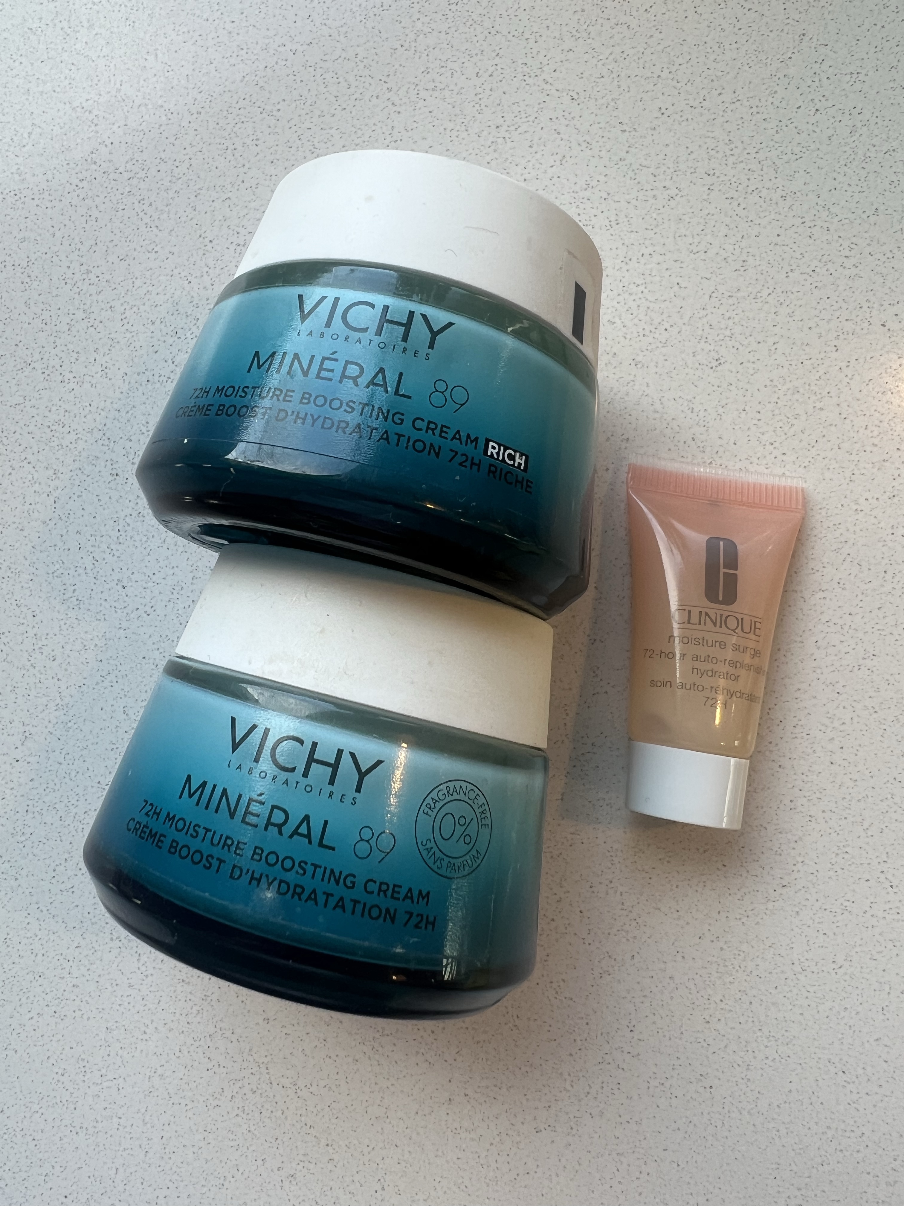 PD: Verán en la foto, una mini muestra de la de Clinique Moisture Surge 72hs de hidratación, que la había probado hace mil años y como me gustó mucho, también la probé para ver que tal (leo esa misma promesa en ambos pack y se me hace agua a la boca poder compararlas). La verdad es MUY parecida en nivel de hidratación. Ahora sé que dice «100hs horas de hidratación jaa», no sé si la fórmula es exactamente la misma. Pero esta es más GEL que las de Vichy. Por lo que entiendo, no trabaja a nivel de barrera cutánea como la de Vichy, sino 100% enfocado en hidratación. Se los comento, si por las probaron y les sirve de referencia.
