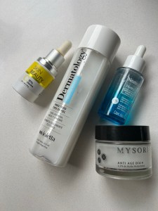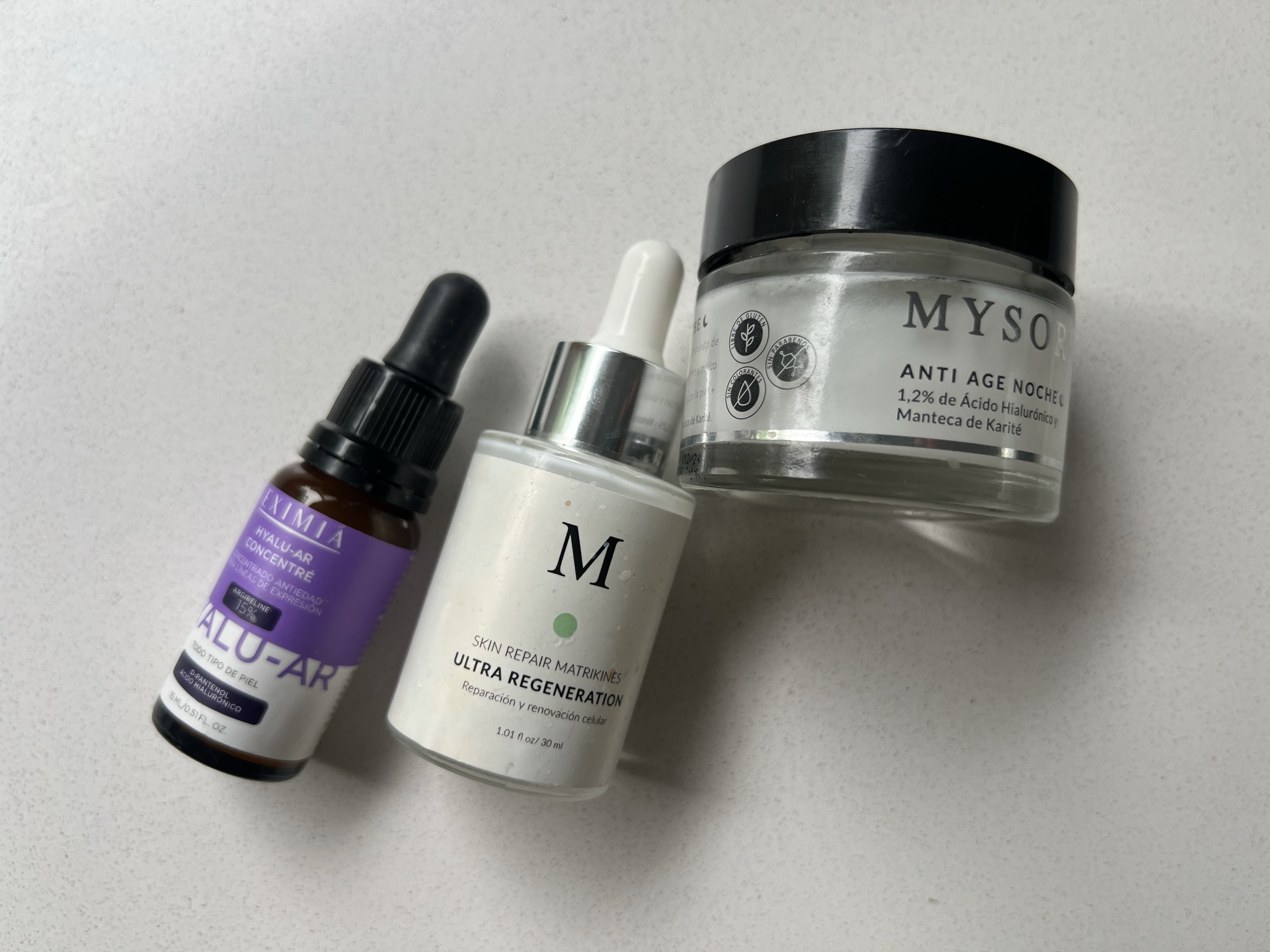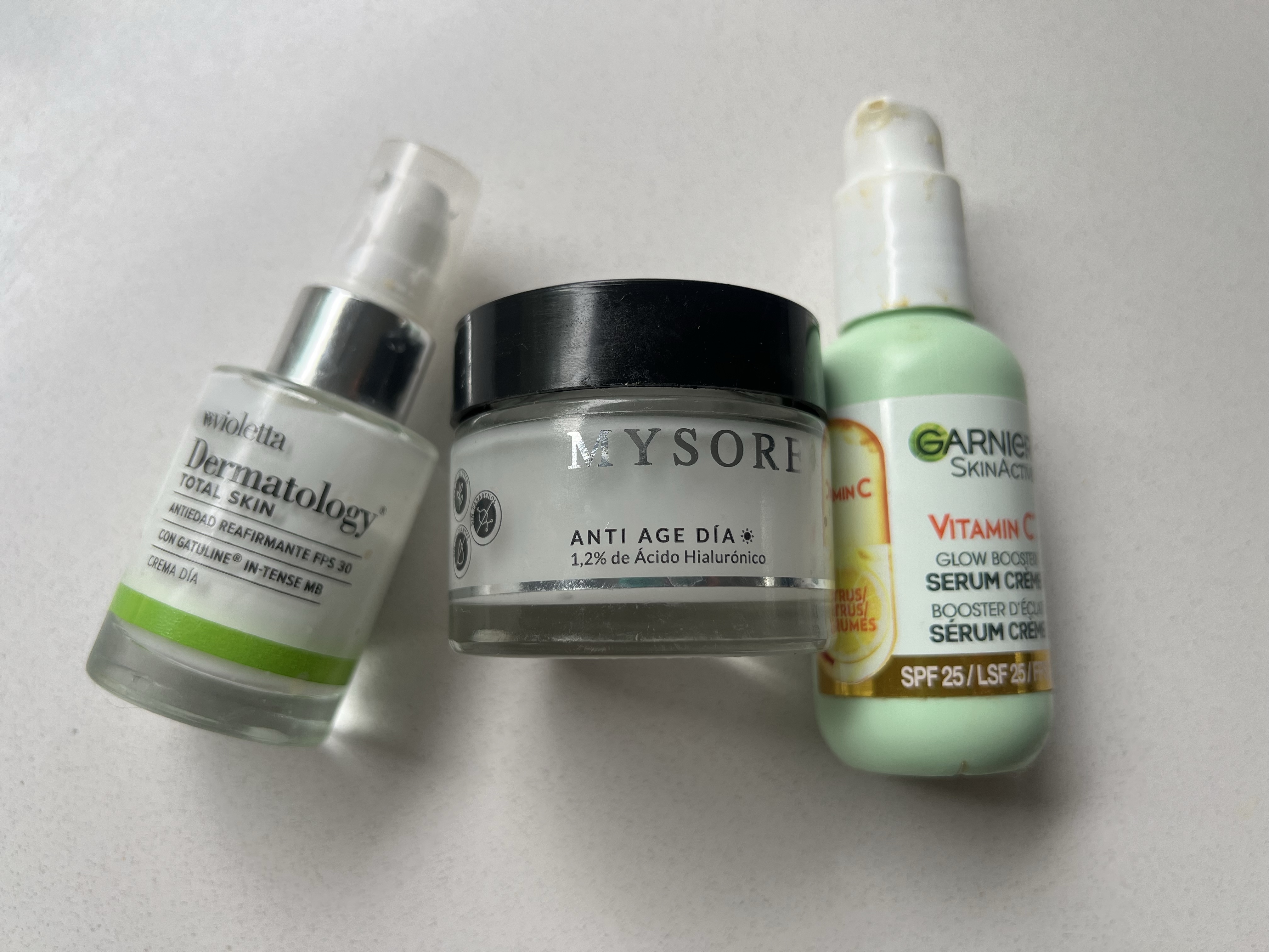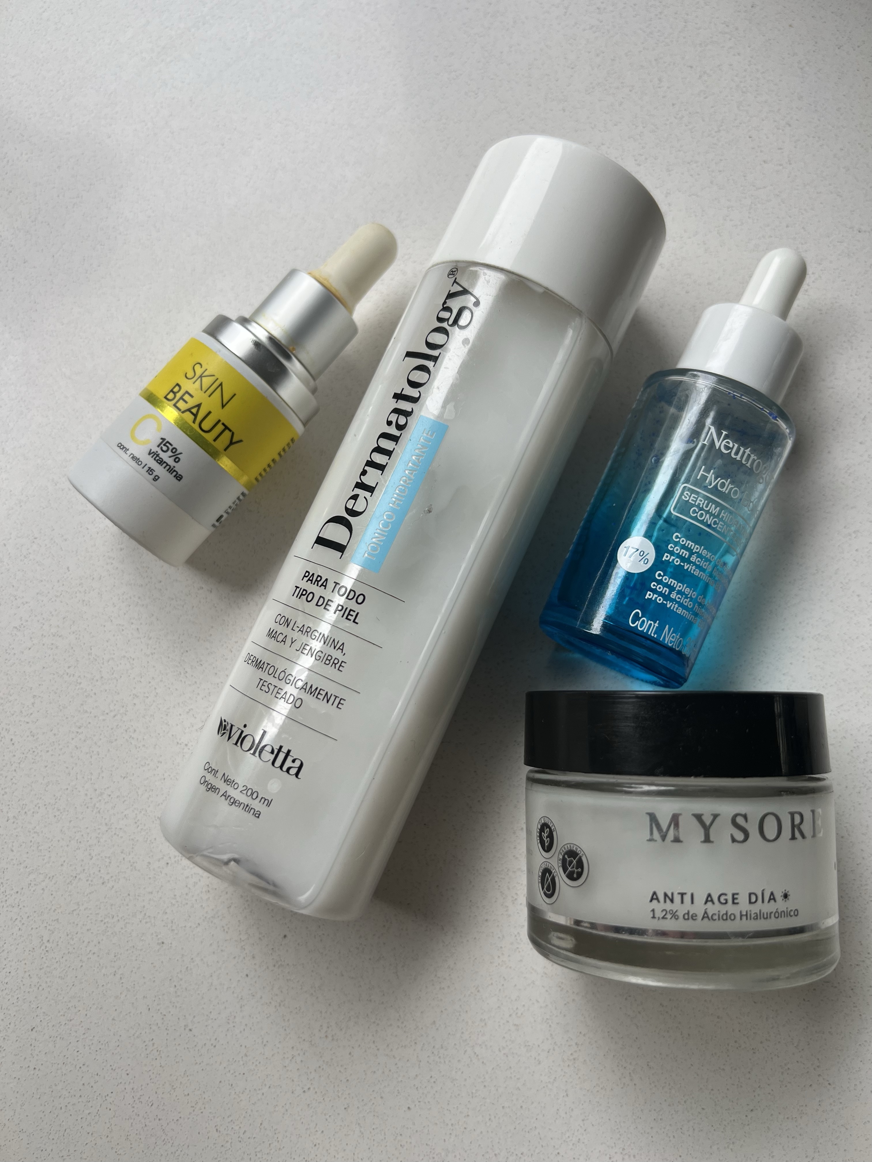 Acá probé muchas cosas a la vez. Pero para resumirles cómo sería si no hubiera usado tantas cosas, esta imagen lo resume: vitamina c+ tónico hidratante + ácido hialurónico+ crema. Este es el esquema que más menos siempre repito.