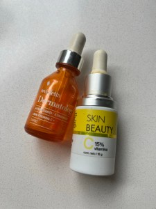 Empecemos entonces por vitamina C: acá probé 2 opciones. Una pura (Skin beauty con ácido ascórbico puro al 15%) y otra derivada (la de Dermatology de Violetta). Recuerden que pura o derivada no es mala o buena. Simplemente que las puras, son más efectivas pero también más irritantes y en ciertas pieles es casi imposible de usar. Al mismo tiempo, el lado B es que se oxidan (se oscurecen y así pierden su efecto antioxidante). Las derivadas no tienen estos bemoles, pero si sos de usar puras (como yo) es probable que no le veas mucho resultado.