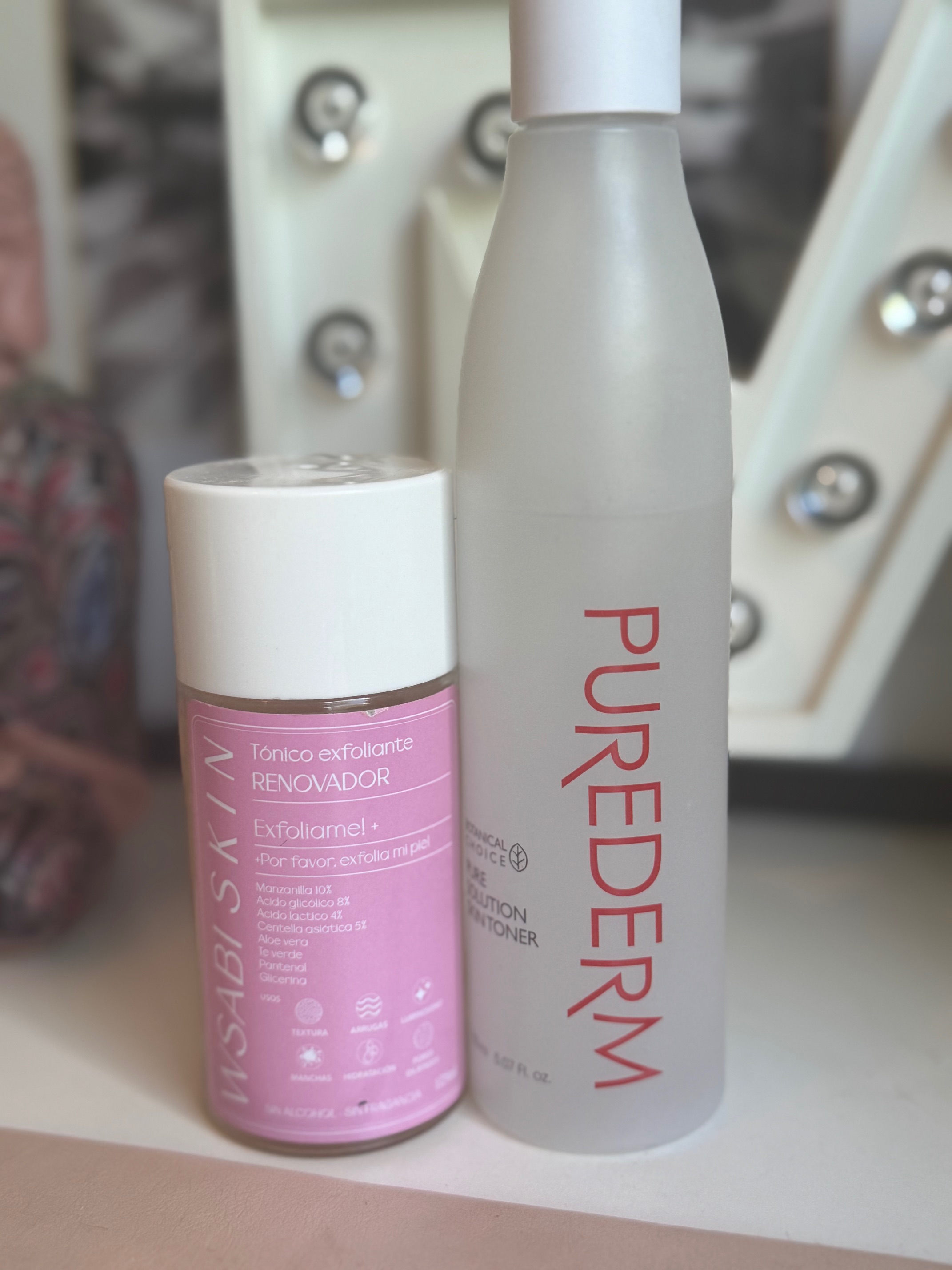 Por otro lado, una marca debutante en mis rutinas Wabi Sabi. Esta marca argentina, con nombre japonés, creada por Dana (@chica_japonesa) viene en 3 formatos para el rostro. Yo probé el exfoliante, que tiene manzanilla (al 10%), glicólico, láctico y centella asiática entre otros. Este si o si es para usar de noche, en piel limpia. Es un tónico sin fragancia ni alcohol. Y al tener manzanilla ayuda de alguna forma a hacer más tolerante la irritación que pueden producir los activos irritantes de la fórmula. Es también como el de Purederm, un tónico con bastante cuerpo. Con apenas unas gotas alcanza y sobra (de hecho el mismo pack, tiene una salida que dosifica perfectamente la cantidad). Yo soy fan del glicólico, y pensé que el hecho de que fuera más «reparador» quizás sea un atenuante de sus resultados comparado con otros que probé. Y la realidad es que no. Es super lindo, deja la piel divina. Incluso diría ojo, porque un poco pica, pese a todo lo que mencioné de su fórmula.