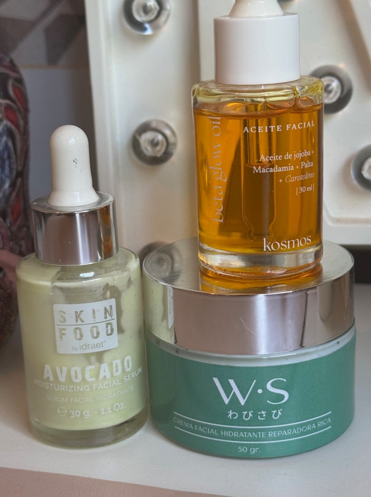 Por otro lado, dos que terminé combinando: La crema facial hidratante reparadora RICA de Wabi Sabi con el aceite beta glow de Kosmos.