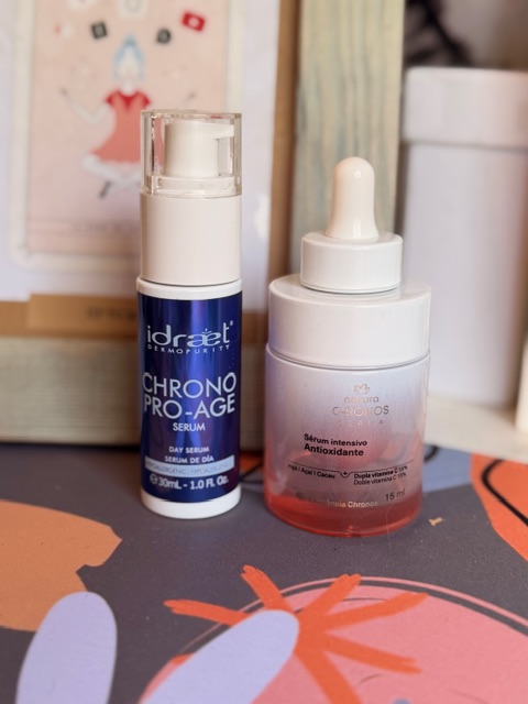 Acá les cuento que 3/4 de este bimestre sobreviví con el Serum Chrono Pro Age de Idraet, al punto que me lo terminé completo. Este serum de día,como indica su nombre, sirve para mejorar la calidad de la piel «madura». Contiene para esto «Neurophroline», Poptide y Retinol Vegetal, lo cual refuerza la barrera cutánea y libera un neuropéptido calmante. Lo que yo vi, es un serum muy liviano, poco perfumado (que a veces con los productos de Idraet esto puede ser un tema si la fragancia es muy invasiva), que hidrata e ilumina la piel. Me gustó.