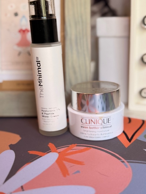 Estas cremas como siempre, también podrían usarse de noche. Pero en este caso, yo las usé de esta forma. Dos hidratantes, muy lindas, pero bien distintas: por un lado el primer producto de tratamiento de The Minimal, su crema hidratante y reafirmante (porque combina hialurónico con Matrixyl 3000). Es muy linda. Bastante liviana.